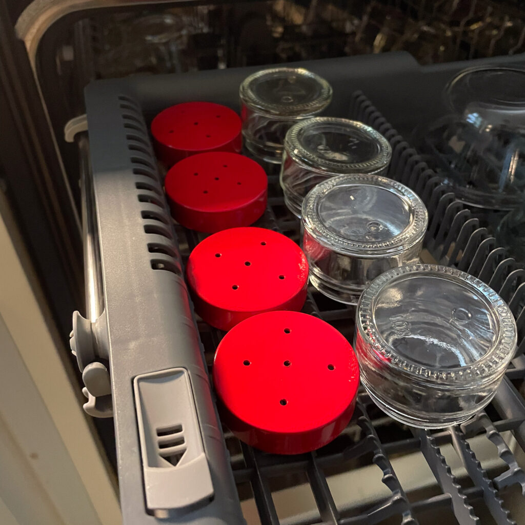 Clean the glass jars and hard plastic caps on the top shelf of your dishwasher, or easily handwash for lasting sparkle.